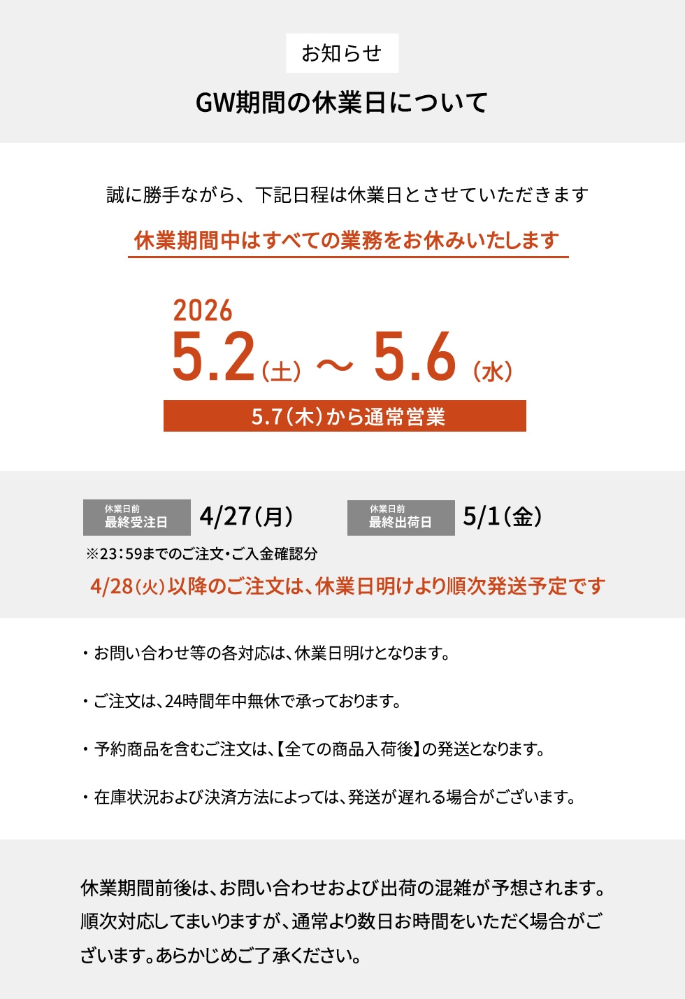 全ての商品が入荷次第【まとめて発送】となります。